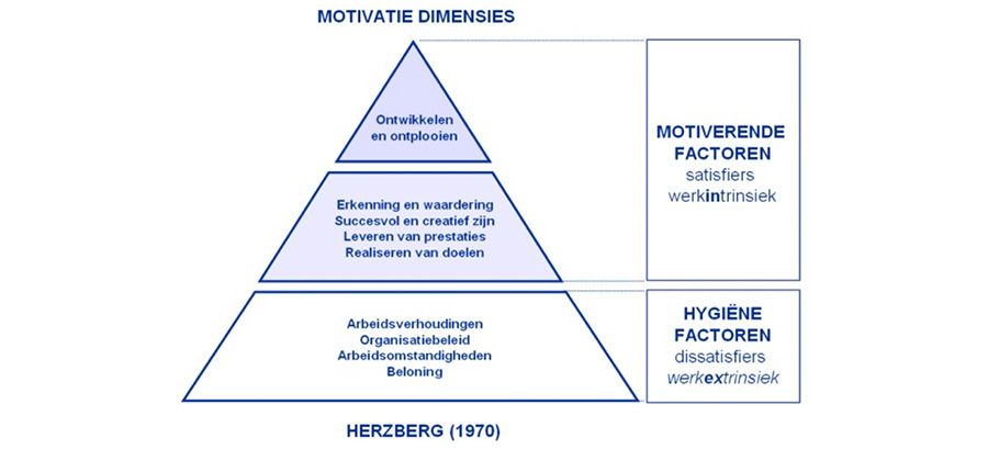 Ook een bekende motivatietheorie komt uit het onderzoek voort van Frederick Herzberg, die al in 1959 hierover bezig was. Hij maakte onderscheid tussen hygiëne-factoren (afwezigheid ervan maakt mensen ontevreden) en motivatiefactoren (meer ervan maakt mensen meer tevreden). Hygiënefactoren zijn bij Herzberg meestal de werkomgeving, motivatiefactoren gaan over het werk zelf. Ze zijn ook wel bekend als Dissatisfiers en Satisfiers.